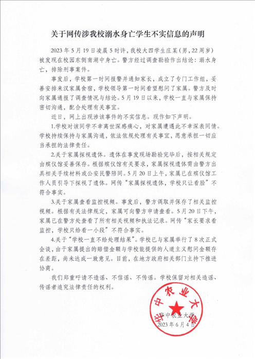 ·學生溺水身亡、不給家長看監(jiān)控視頻?華中農(nóng)業(yè)大學回應(yīng):傳言不實。