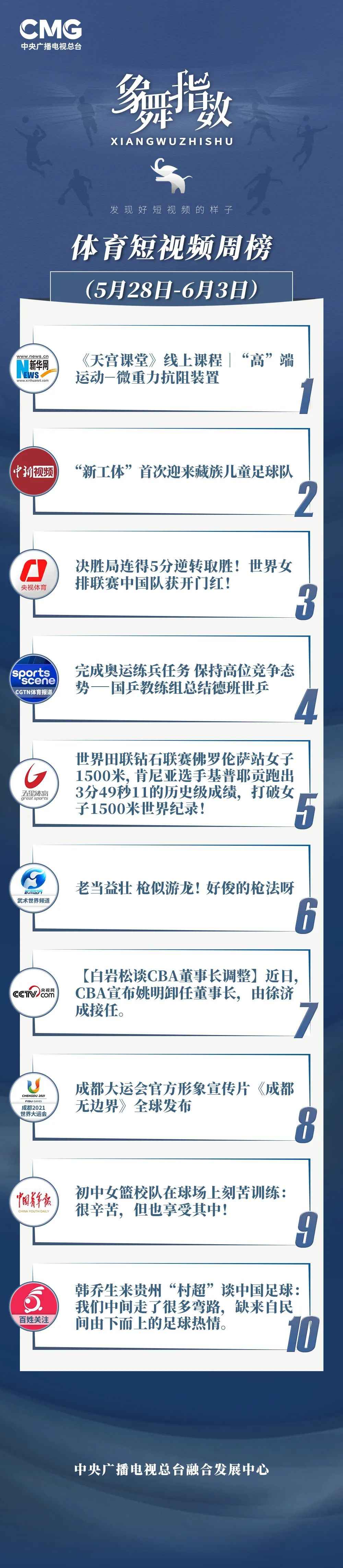 中央廣播電視總臺“象舞指數(shù)”評議品牌,推出體育短視頻周榜、總臺體育短視頻周榜。在5月28日—6月3日,以下內(nèi)容獲得矚目: