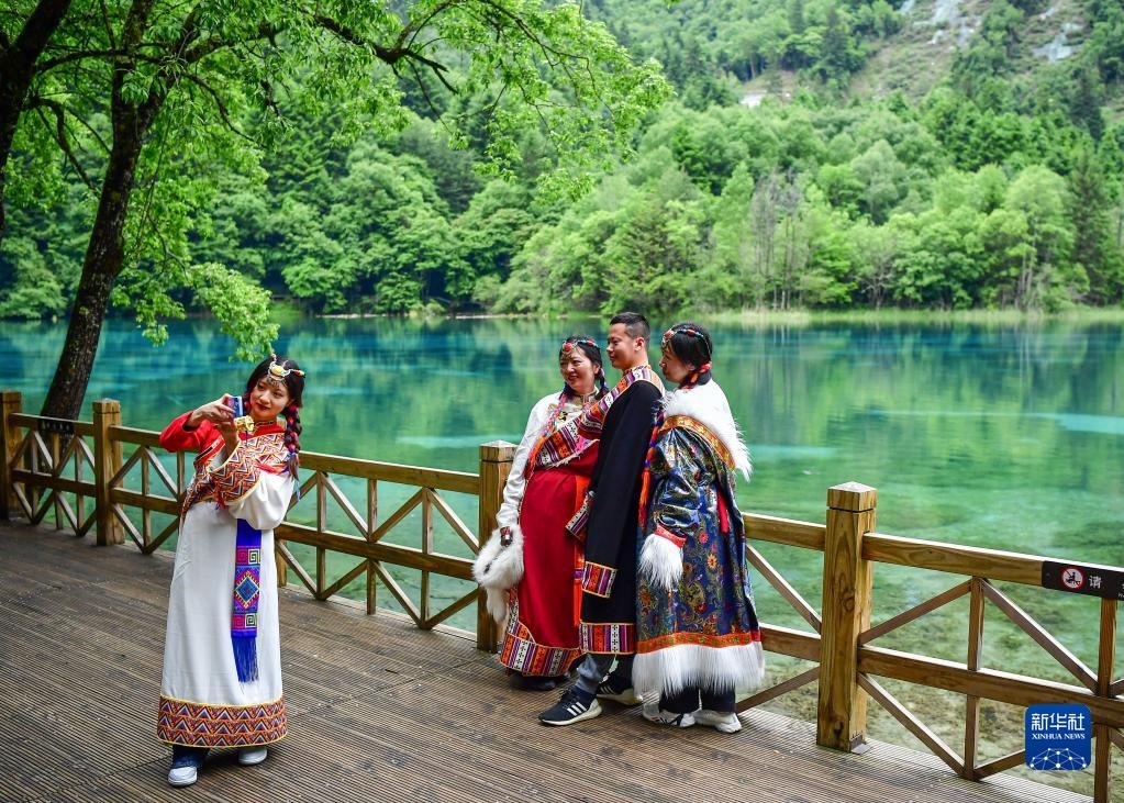 游客身著民族傳統(tǒng)服飾在九寨溝景區(qū)拍照留念(6月7日攝)。