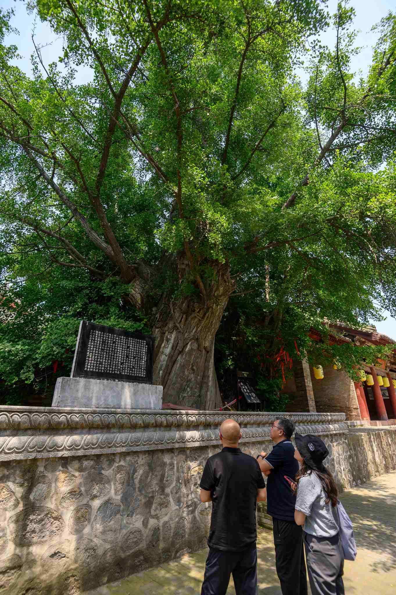 2023年6月9日,山西省晉城市,游客在古村落冶底村參觀(guān)古銀杏樹(shù)。據(jù)樹(shù)旁碑文記載,這棵銀杏樹(shù)高25.4米,胸徑3.25米,樹(shù)齡大約為6200年。視覺(jué)中國(guó)