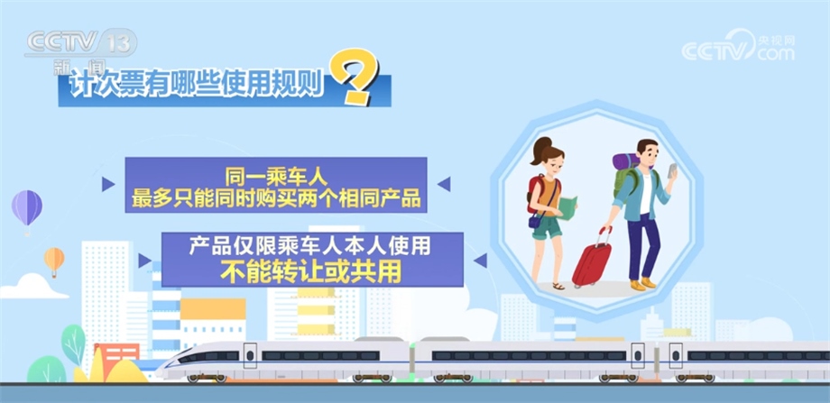 鐵路12306科創(chuàng)中心高級技術經理 王永峰:20次計次票指的是旅客可以在90天內最多使用20次,在購買產品時指定區(qū)間、指定席別的這樣一個產品。定期票指的是一個可以在30日內最多乘坐60次指定區(qū)間和席別的車次。目前,計次票是按照常規(guī)票價的九五折來進行定價,定期票有一個上限次數是30日最多乘坐60次,但是我們定價是按照44次來定價。
