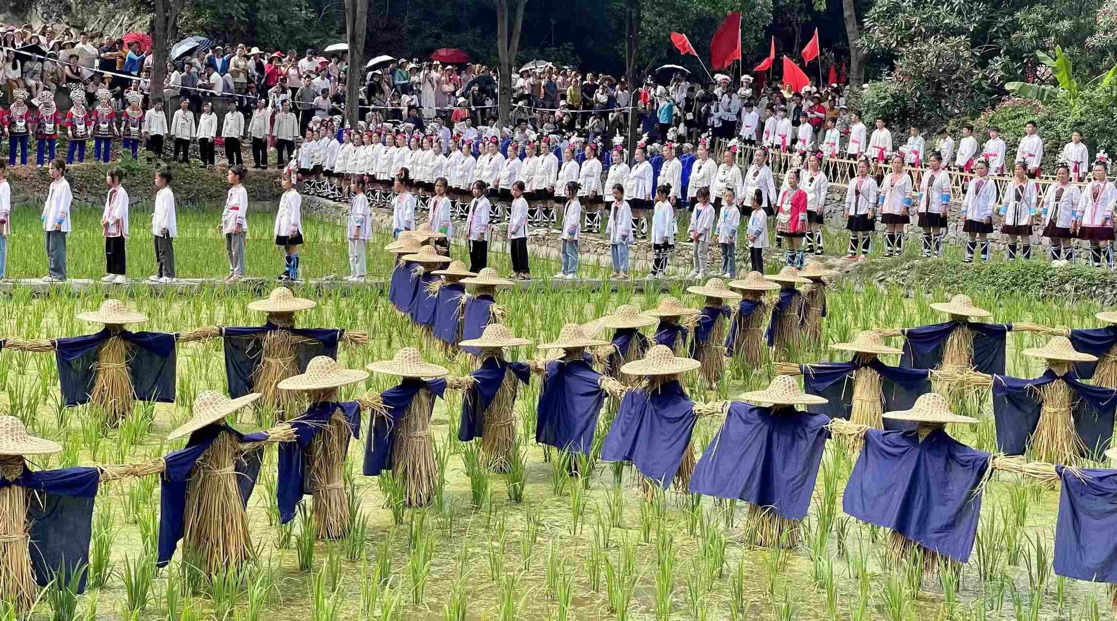 2023年6月10日,侗族同胞在貴州省黎平縣肇興侗寨田園實(shí)景展示侗族大歌。