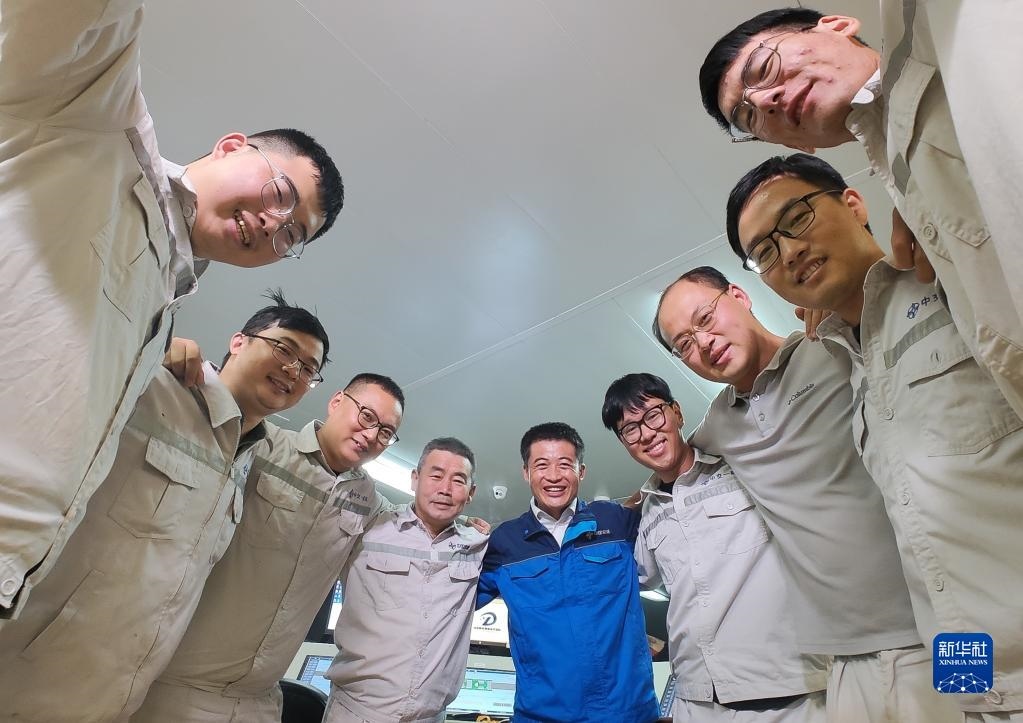 6月11日,在深中通道海底隧道管節(jié)最終接頭合龍后,中交一航局深中項目測管中心負(fù)責(zé)人鎖旭宏(中)和團隊成員一起慶賀。