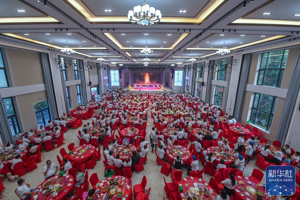 浙江建德市新安江街道梅坪村村民在村文化禮堂內參加百家宴并觀看文藝演出(5月27日攝)。新華社記者 徐昱 攝