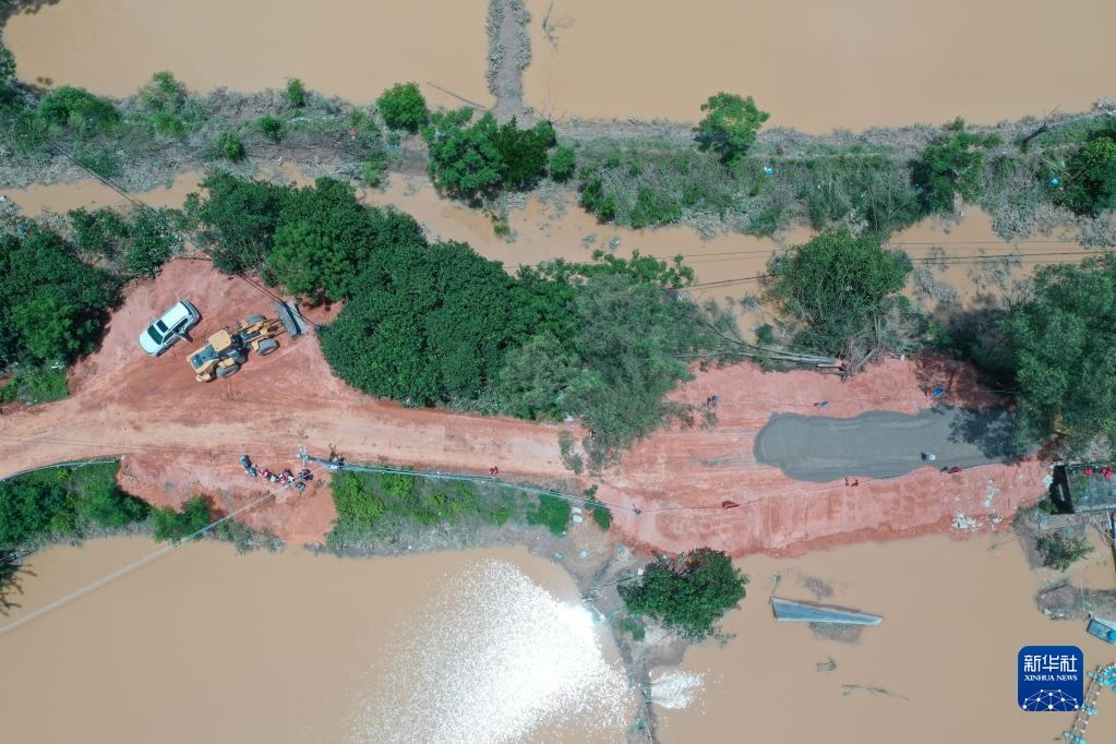 6月11日,在廣西合浦縣白沙鎮(zhèn),工人在施工修復(fù)遭洪水損毀的堤壩(無(wú)人機(jī)照片)。