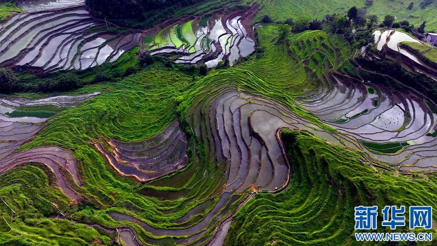 近日,江西省宜春市萬載縣高村鎮(zhèn)新竹村村民在高山梯田勞作,忙碌的身影與層層疊疊的梯田交相輝映。新華網(wǎng)發(fā) 鄧龍華 攝