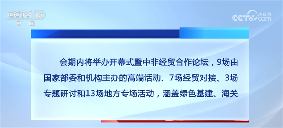 會(huì)期內(nèi)將舉辦開幕式暨中非經(jīng)貿(mào)合作論壇,9場由國家部委和機(jī)構(gòu)主辦的高端活動(dòng)、7場經(jīng)貿(mào)對(duì)接、3場專題研討和13場地方專場活動(dòng),涵蓋綠色基建、海關(guān)檢疫、醫(yī)藥衛(wèi)生、農(nóng)食產(chǎn)品、輕工紡織、產(chǎn)業(yè)園區(qū)、婦女青年、職業(yè)教育等領(lǐng)域,還將發(fā)布《中非經(jīng)貿(mào)關(guān)系報(bào)告》、中非貿(mào)易指數(shù)等近20項(xiàng)成果。
