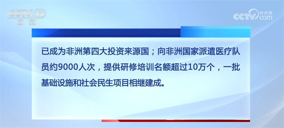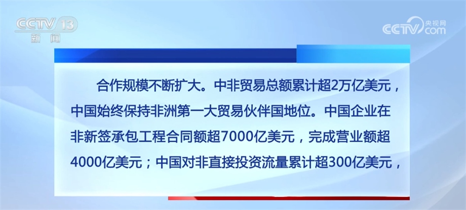 合作規(guī)模不斷擴(kuò)大。中非貿(mào)易總額累計(jì)超2萬億美元,中國始終保持非洲第一大貿(mào)易伙伴國地位。中國企業(yè)在非新簽承包工程合同額超7000億美元,完成營業(yè)額超4000億美元;中國對(duì)非直接投資流量累計(jì)超300億美元,已成為非洲第四大投資來源國;向非洲國家派遣醫(yī)療隊(duì)員約9000人次,提供研修培訓(xùn)名額超過10萬個(gè),一批基礎(chǔ)設(shè)施和社會(huì)民生項(xiàng)目相繼建成。