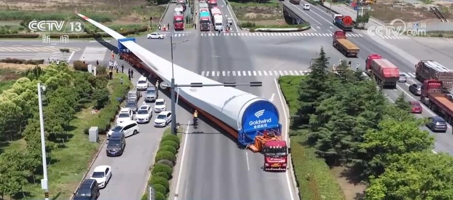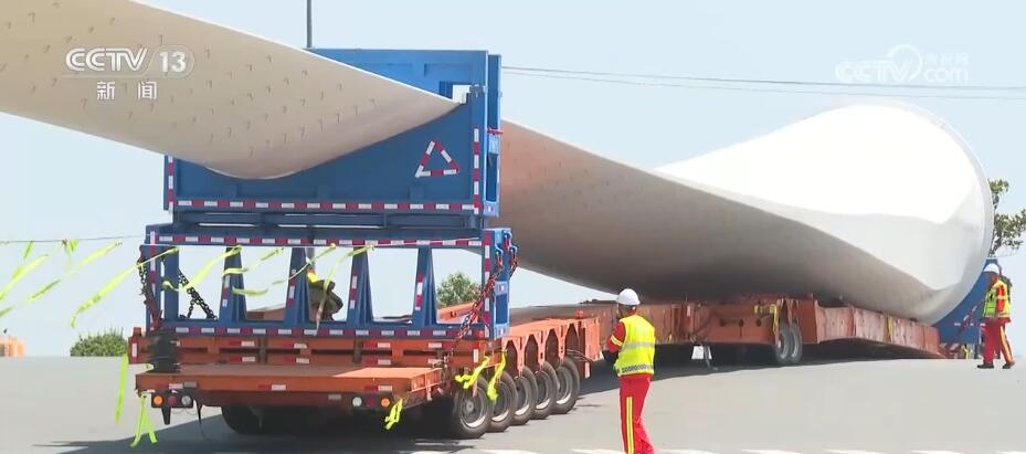 央視網(wǎng)消息:今天(6月14日)上午,100%我國自主知識產(chǎn)權(quán)的123米超長海上風(fēng)電葉片在江蘇連云港啟動陸地轉(zhuǎn)運工作。上午9時,代表著我國風(fēng)電裝備最新技術(shù)水準的大葉片,從廠區(qū)到港口碼頭,陸地運輸全程約30公里,耗時約3到4個小時,其中運輸大葉片的車輛還要拐過90度的直角彎。如此大體量的裝備運輸是一個復(fù)雜的過程,其中有哪些技術(shù)難點?來看記者今天上午從現(xiàn)場發(fā)回的報道。