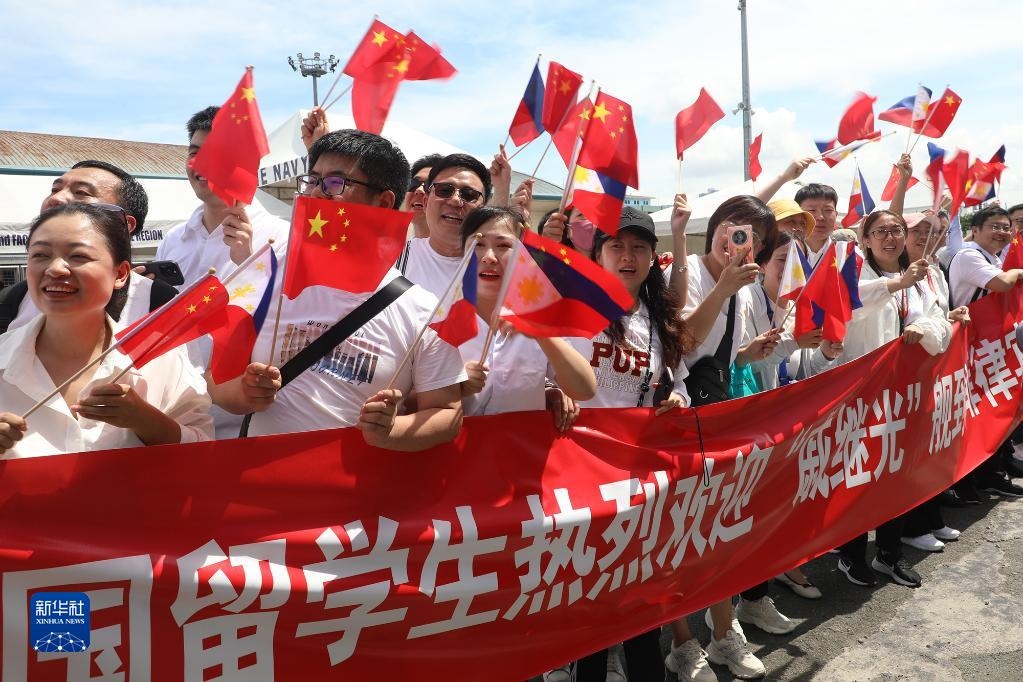 6月14日,在菲律賓馬尼拉港,人們?cè)诎哆呌悠堇^光艦抵達(dá)。   新華社發(fā)