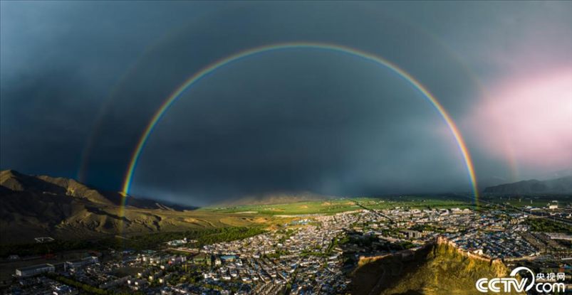西藏日喀則:江孜宗山古堡上空現彩虹。