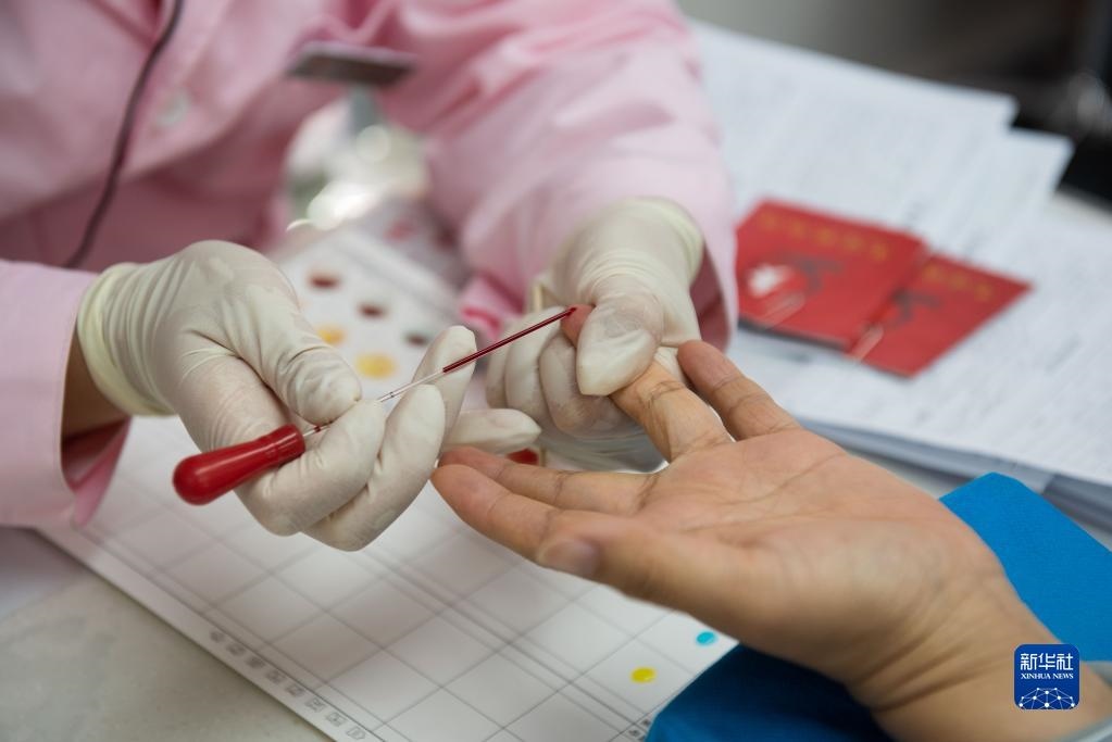 6月14日,在寧夏銀川市新華街愛(ài)心獻(xiàn)血車內(nèi),醫(yī)務(wù)人員為獻(xiàn)血者進(jìn)行血樣檢測(cè)。