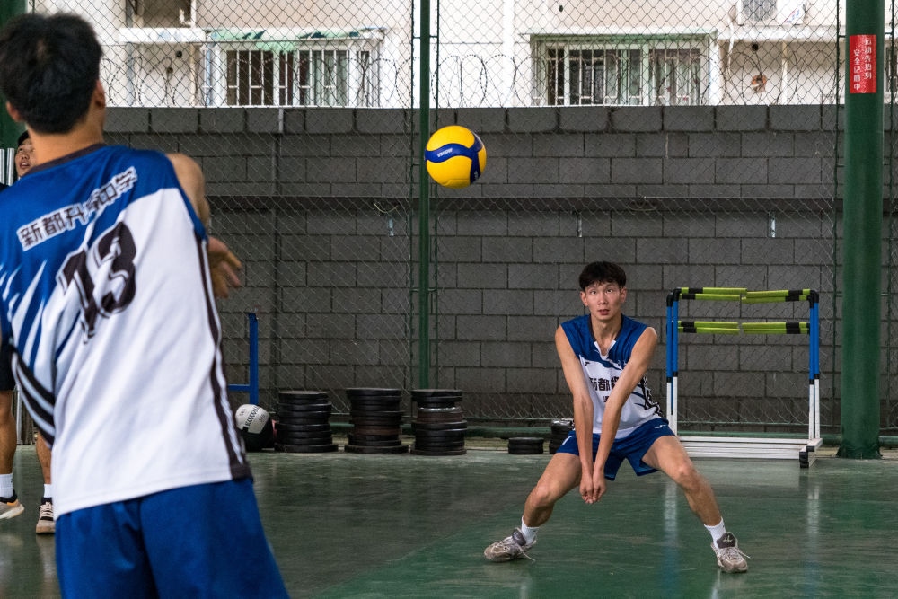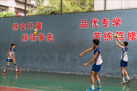 隨著下課鈴聲響起,學(xué)生們紛紛跑到操場(chǎng)上活動(dòng)。操場(chǎng)一側(cè)是學(xué)校的排球訓(xùn)練館,二十幾名排球少年正在這里揮汗如雨地進(jìn)行著每天的排球訓(xùn)練。目前,該校男排隊(duì)有8名隊(duì)員入選本屆四川省青年男排集訓(xùn)隊(duì)。