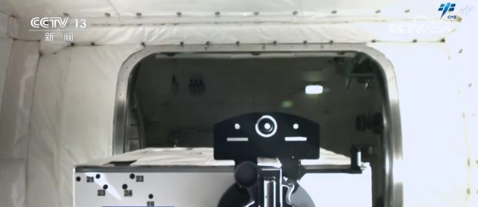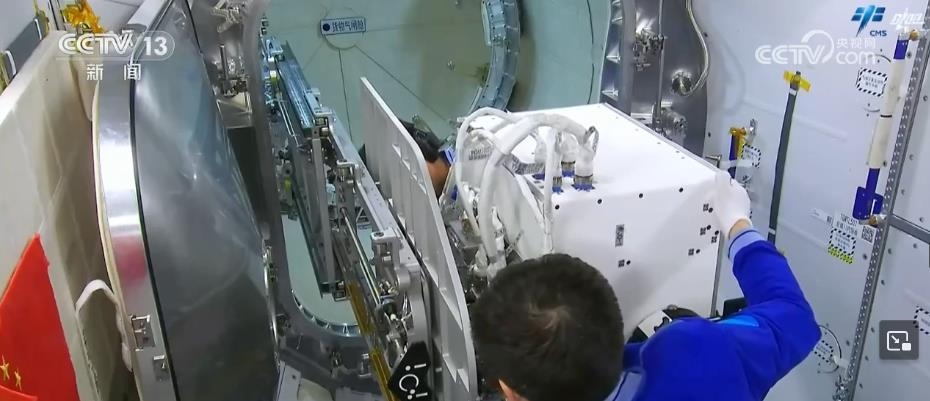 這是3位航天員正在夢天實驗艙進行空間輻射生物學暴露實驗裝置出艙工作,航天員將載荷安裝到載荷轉移機構。載荷出艙前,航天員在反復仔細檢查,隨后,關閉夢天實驗艙貨物氣閘艙艙門。通過該裝置開展空間粒子輻射等環(huán)境要素,對樣本材料生物學效應的研究,為科學實驗生物樣品提供生命保障。