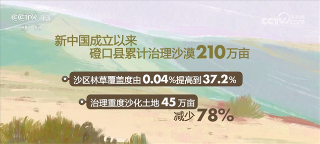 數(shù)據(jù)顯示,新中國成立以來,磴口縣累計(jì)治理沙漠210萬畝,沙區(qū)林草覆蓋度由0.04%提高到37.2%,治理重度沙化土地45萬畝,減少78%,向黃河年輸沙量減少到370萬噸,降低94.7%,沙漠治理呈現(xiàn)出“整體好轉(zhuǎn)、改善加速”的良好態(tài)勢(shì),也因此形成了防沙治沙“磴口模式”。