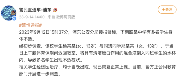 ·上海警方通報“中學(xué)生在校投放不明物質(zhì)致同學(xué)飲用后送醫(yī)”。