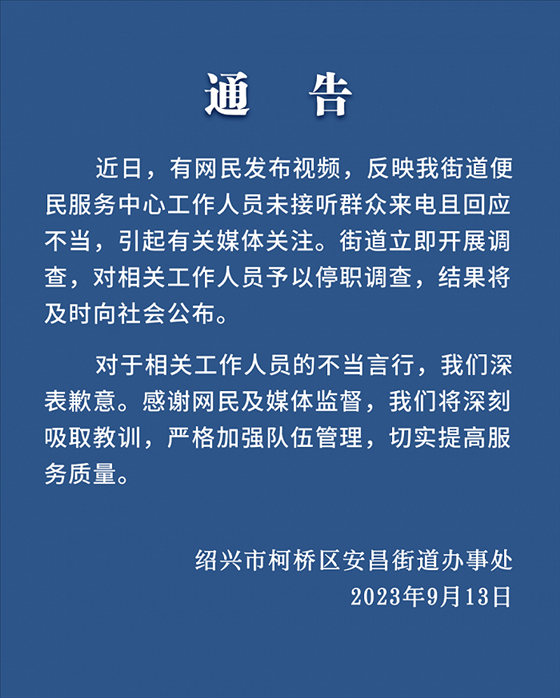 ·浙江紹興有市民發(fā)視頻稱,打不通安昌便民中心電話,來到現(xiàn)場發(fā)現(xiàn)工作人員都在聊天,吐槽電話是擺設(shè)。官方通報:相關(guān)工作人員停職調(diào)查。
