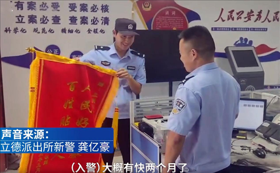 9月5日,安徽亳州。立德派出所新警龔億豪幫助轄區(qū)群眾找回失物,收到群眾送來的錦旗后,龔億豪開心地向同事“炫耀”,秒變“顯眼包”。
