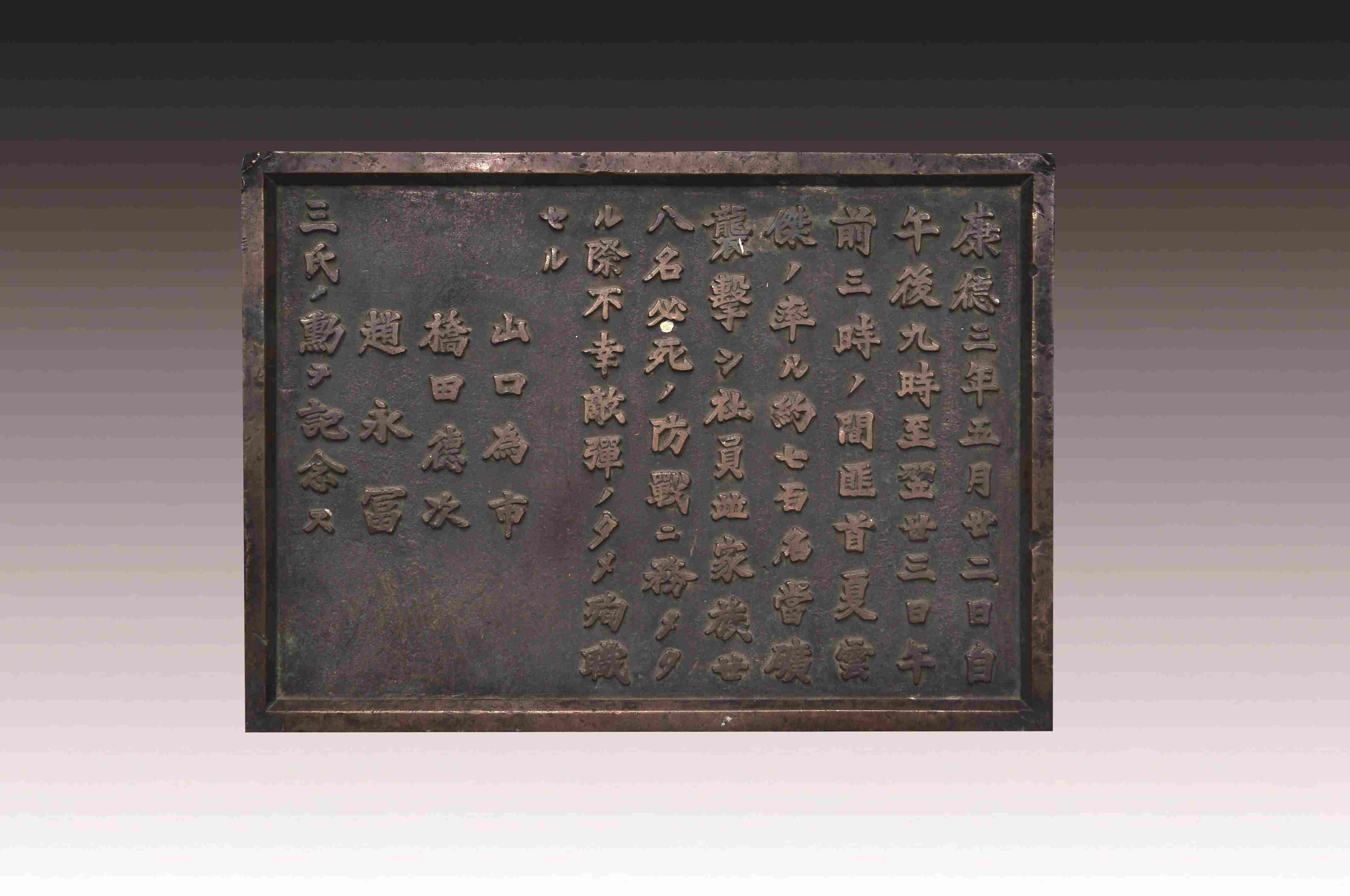這塊碑文銅牌來自黑龍江鶴崗礦區(qū)的一座“忠靈塔”上,是日本侵略者為侵華戰(zhàn)爭中戰(zhàn)死的日偽軍而建。碑文銅牌,長51厘米、高36.5厘米、寬2厘米、重12千克。上面的文字記載了日偽軍和抗聯(lián)戰(zhàn)士戰(zhàn)斗過程。從表述內(nèi)容來看,這塊碑文具有極大欺騙性。它制造了普通百姓遭土匪襲擊的“無辜”假象,妄圖以此加深東北民眾與革命隊(duì)伍之間的對立情緒。而事實(shí)真相是,1936年5月22日夜,東北人民革命軍第六軍軍長夏云杰指揮六軍第一、二、三團(tuán),分兵兩路襲擊了鶴崗礦山。在我黨地下工作人員的密切配合下,順利解除了礦山警察二隊(duì)的全部武裝,并擊斃日軍指導(dǎo)官山口為市、橋田德次和偽礦山警察大隊(duì)隊(duì)長趙永富。這次戰(zhàn)斗繳獲敵人大批槍支彈藥,我軍無一人傷亡。23日凌晨,夏云杰率領(lǐng)部隊(duì)攜帶戰(zhàn)利品凱旋。
