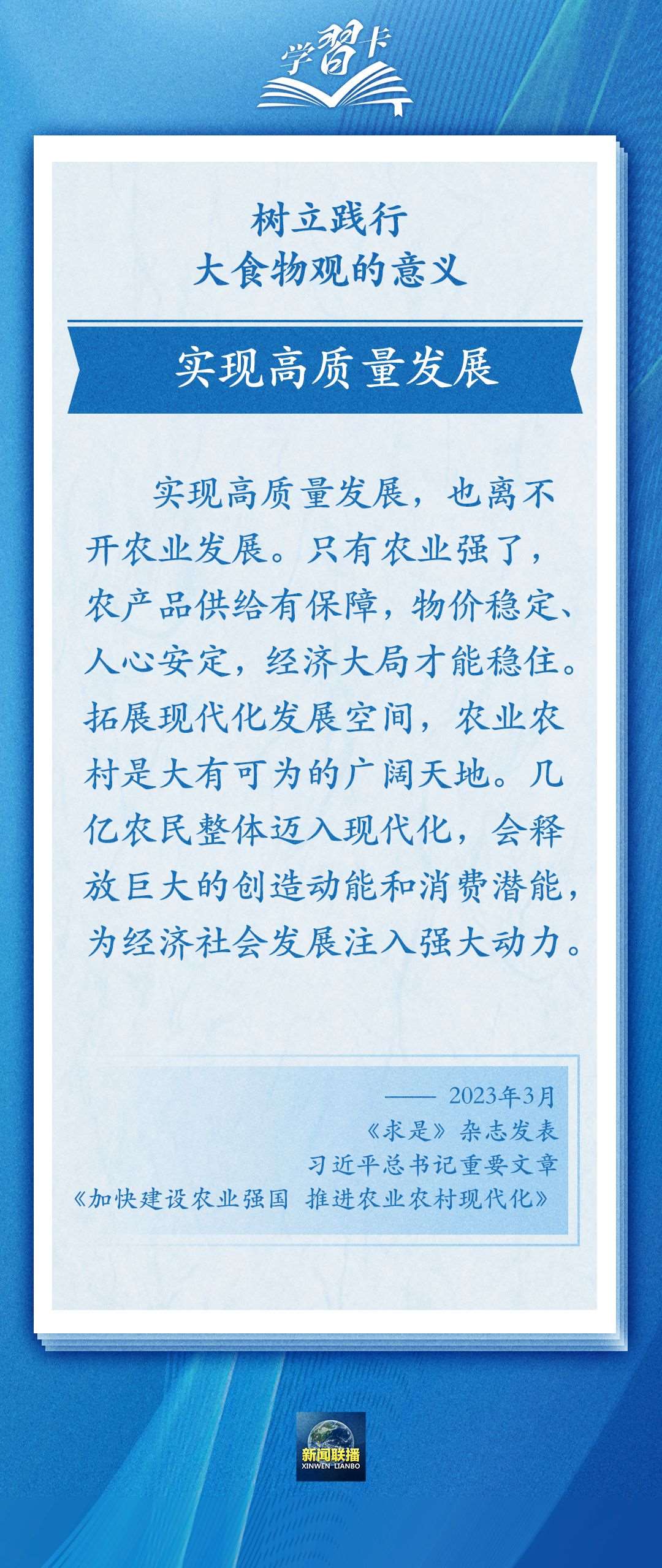 今年4月,總書(shū)記在廣東湛江考察時(shí)指出,要樹(shù)立大食物觀,既向陸地要食物,也向海洋要食物。前不久,總書(shū)記主持召開(kāi)新時(shí)代推動(dòng)?xùn)|北全面振興座談會(huì)強(qiáng)調(diào),踐行大食物觀,把農(nóng)業(yè)建成大產(chǎn)業(yè)。