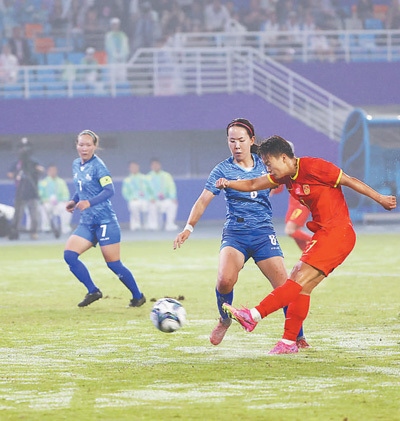 9月22日,亞運女足小組賽,中國女足以16∶0戰(zhàn)勝蒙古國女足。圖為隊員在比賽中。本報記者 張武軍攝
