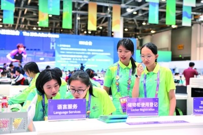 9月22日,亞運(yùn)會(huì)主新聞中心的志愿者們?cè)诠ぷ?。本?bào)記者 楊震攝/光明圖片