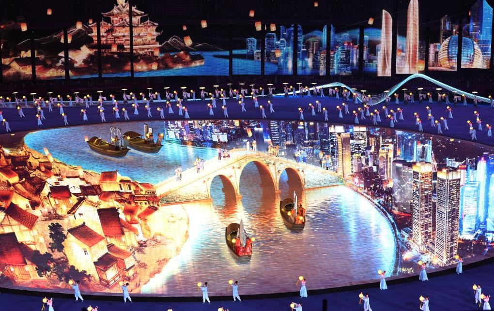 開幕式現(xiàn)場出現(xiàn)了杭州拱宸橋的形象。始建于1631年的拱宸橋,是京杭大運河南端的標志性建筑。2014年6月,中國大運河成功申報世界文化遺產,拱宸橋作為運河水工建筑,成為一處遺產點。