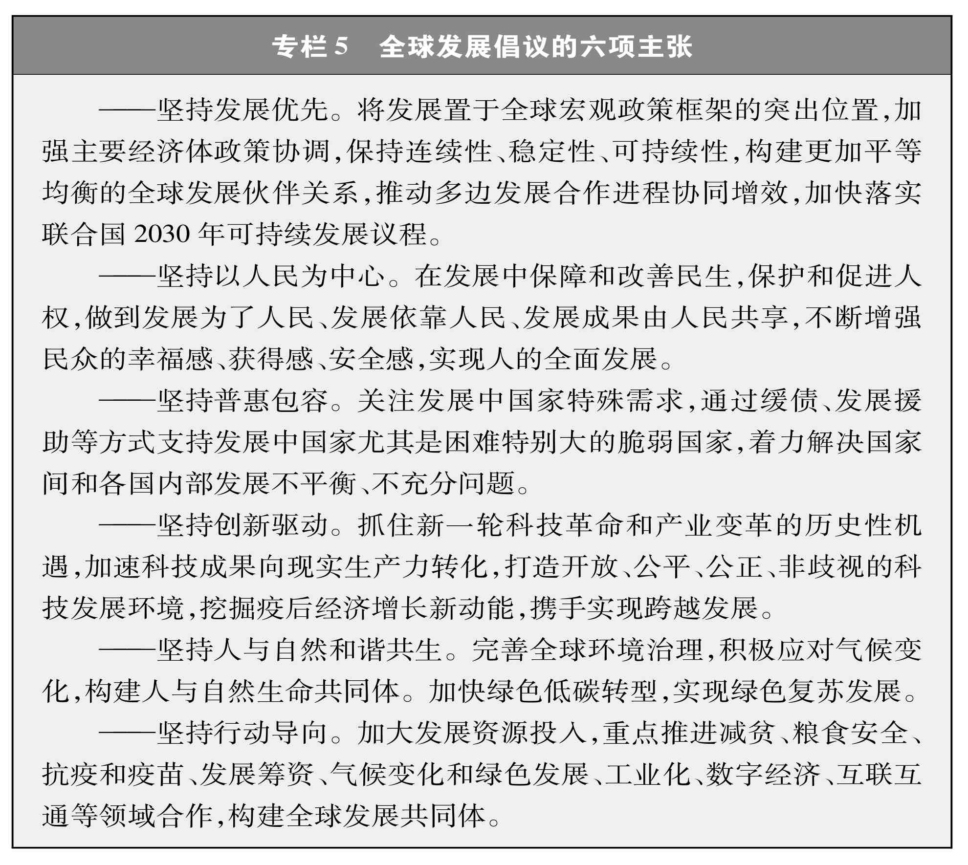 ——中國提出全球發(fā)展倡議,發(fā)出了聚焦發(fā)展、重振合作的時(shí)代強(qiáng)音,為破解發(fā)展難題、推進(jìn)全球發(fā)展事業(yè)貢獻(xiàn)中國力量。全球發(fā)展倡議,最根本的目標(biāo)是加快落實(shí)聯(lián)合國2030年可持續(xù)發(fā)展議程,最核心的要求是堅(jiān)持以人民為中心,最重要的理念是倡導(dǎo)共建團(tuán)結(jié)、平等、均衡、普惠的全球發(fā)展伙伴關(guān)系,最關(guān)鍵的舉措在于堅(jiān)持行動(dòng)導(dǎo)向,推動(dòng)實(shí)現(xiàn)更加強(qiáng)勁、綠色、健康的全球發(fā)展,共建全球發(fā)展共同體。