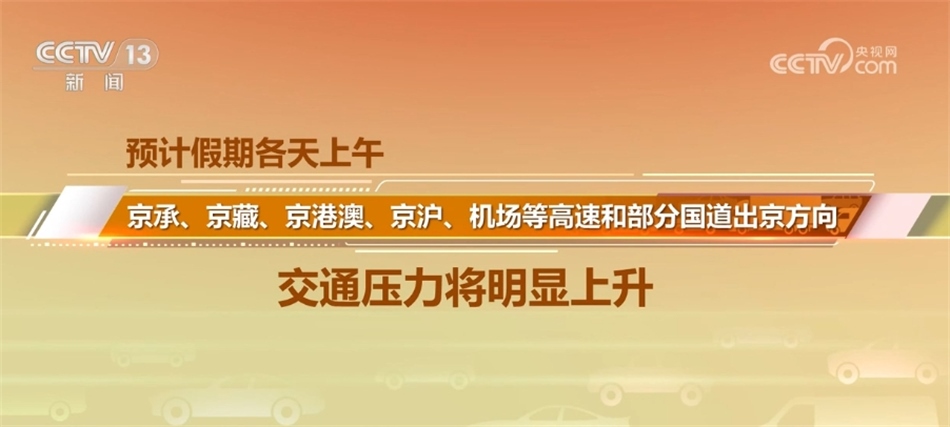 北京市交通部門表示,“雙節(jié)”假日期間,高速公路小客車免費(fèi)通行、尾號(hào)不限行等措施帶動(dòng)群眾出行需求集中釋放,預(yù)計(jì)中超、中網(wǎng)、演出等大型活動(dòng)舉辦場(chǎng)地周邊道路短時(shí)車流集中,連接城區(qū)和郊區(qū)的各條高速公路將出現(xiàn)上午出京、下午進(jìn)京的車流高峰,預(yù)計(jì)假期各天上午,京承、京藏、京港澳、京滬、機(jī)場(chǎng)等高速和部分國(guó)道出京方向的交通壓力將明顯上升。