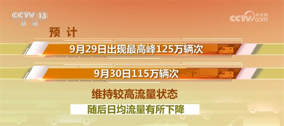 預(yù)計(jì)假期第一天,也就是今天(9月29日)出現(xiàn)最高峰125萬輛次,明天115萬輛次,維持較高流量狀態(tài),隨后日均流量有所下降。假期第七日和第八日路網(wǎng)流量將再度上升,且下午16時(shí)至19時(shí)易出現(xiàn)返程車流高峰。