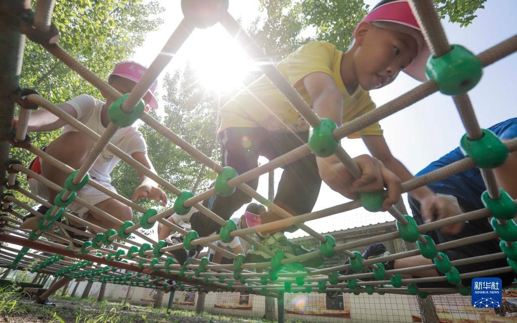 7月8日,參加少年夏令營的孩子在河北省遵化市小廠鄉(xiāng)的訓(xùn)練營地進(jìn)行穿越障礙訓(xùn)練。