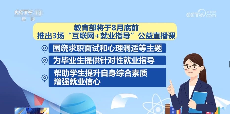 據(jù)了解,教育部將于8月底前推出3場“互聯(lián)網(wǎng)+就業(yè)指導”公益直播課,圍繞求職面試和心理調(diào)適等主題,為畢業(yè)生提供針對性就業(yè)指導,幫助學生提升自身綜合素質(zhì)、增強就業(yè)信心。