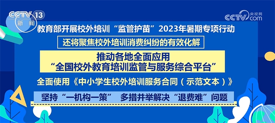 央視網(wǎng)消息:日前,教育部印發(fā)通知,決定于7月至8月在全國(guó)開展校外培訓(xùn)“監(jiān)管護(hù)苗”2023年暑期專項(xiàng)行動(dòng),將聚焦當(dāng)前校外培訓(xùn)治理中存在的隱形變異培訓(xùn)等方面問(wèn)題,進(jìn)行全面排查治理。?