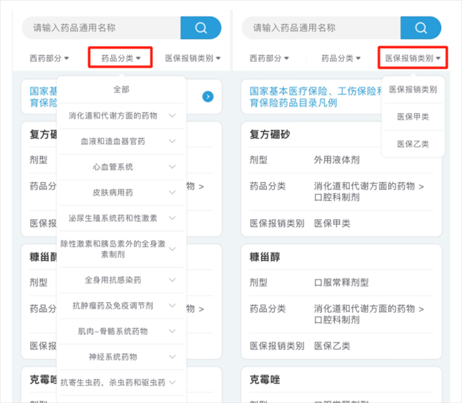 也可以根據(jù)自己的需求,選擇“藥品分類”或“醫(yī)保報(bào)銷類別”進(jìn)行篩選。