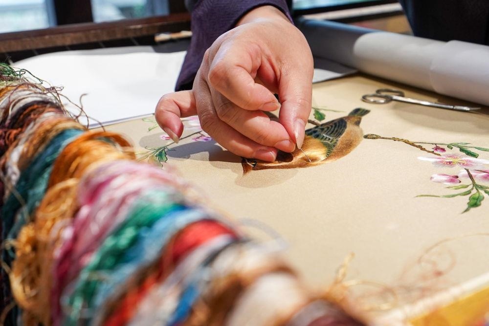2023年7月6日,盧建英在江蘇蘇州平江路的工作室內(nèi)刺繡。