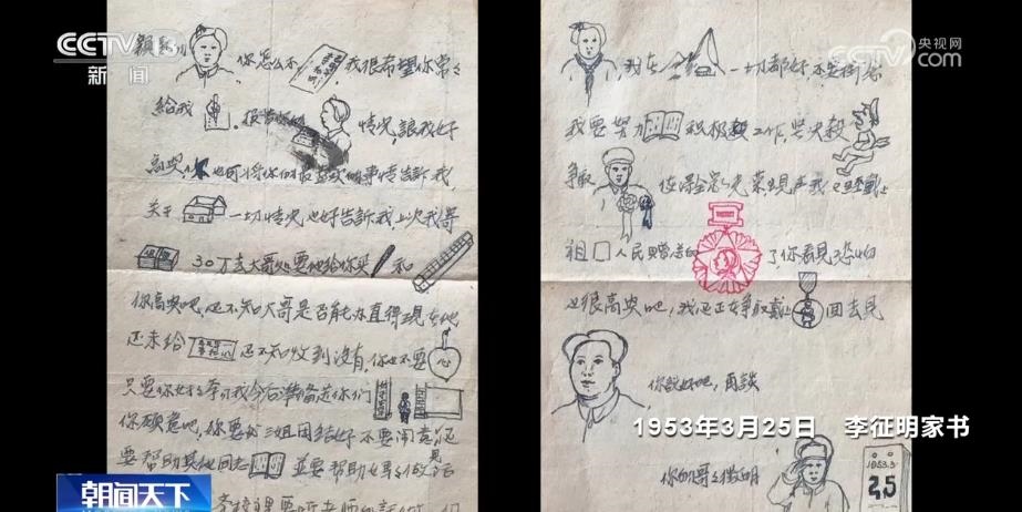 這是一封1953年3月25日從抗美援朝戰(zhàn)場發(fā)往江蘇宿遷的信。在這封戰(zhàn)地家書中,志愿軍戰(zhàn)士李征明為未來的奮斗目標做出規(guī)劃。因為妹妹們的年齡還很小、識字不多,李征明擔心她們看不懂,就在信中畫上了許多圖文并茂的小畫。