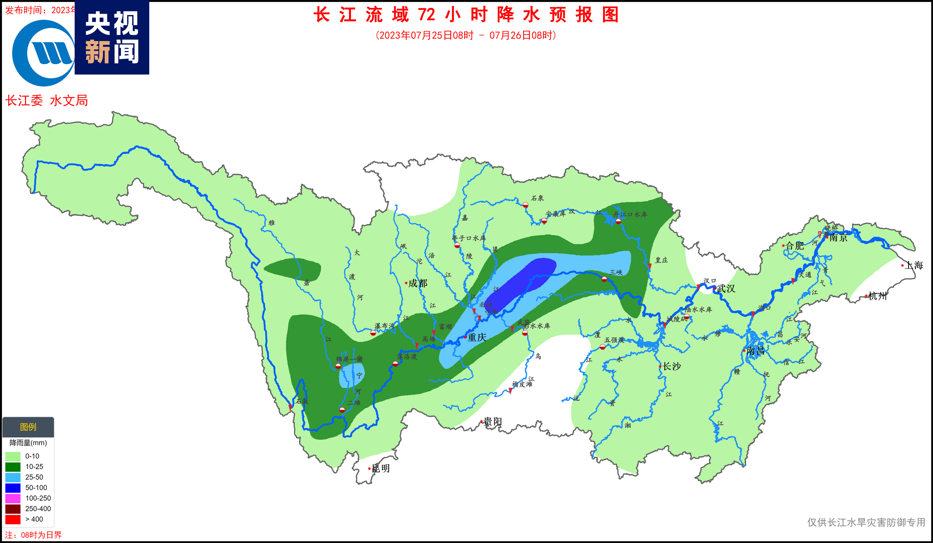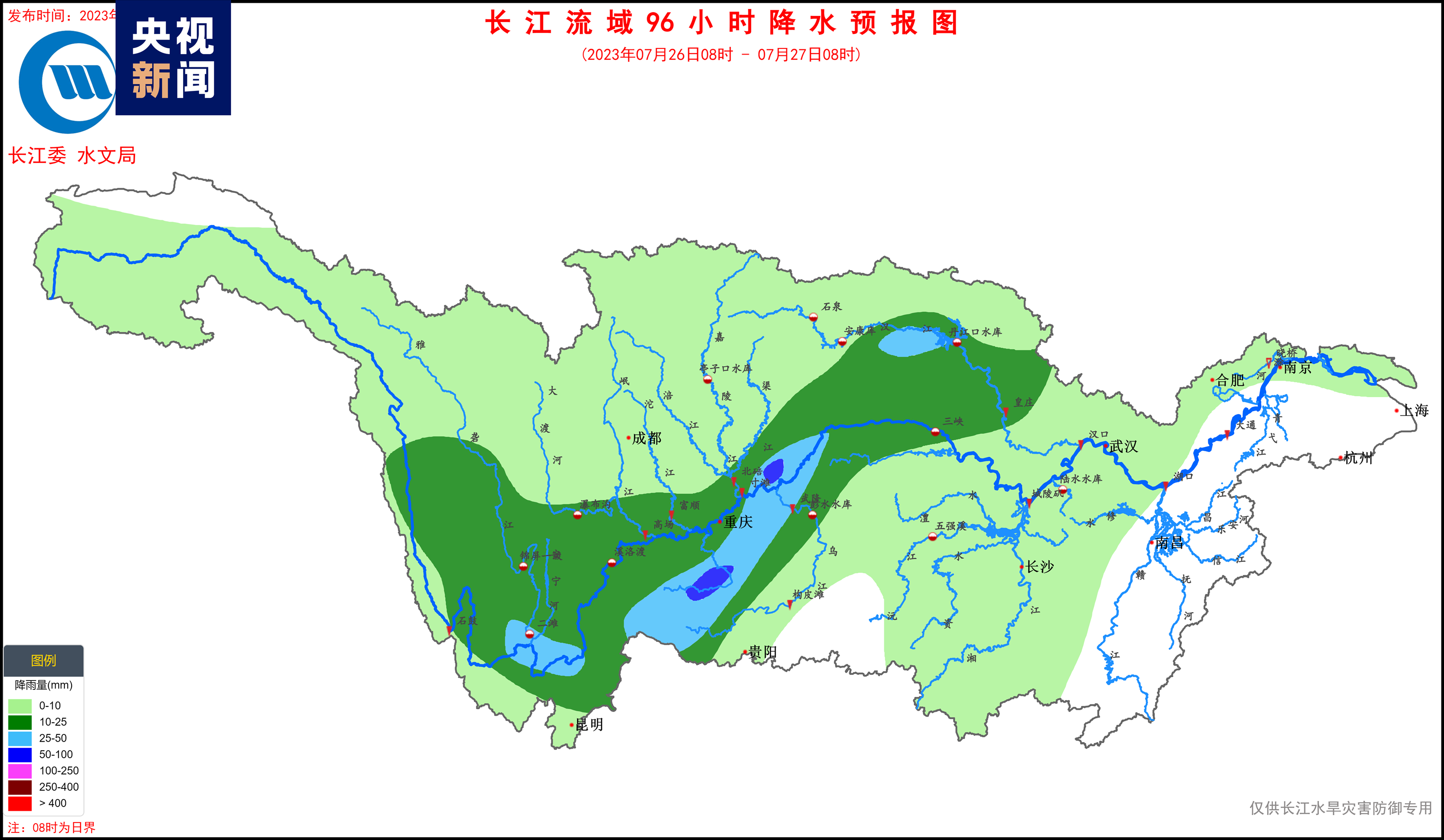 據(jù)水文氣象預(yù)報(bào),7月23日,嘉岷流域北部有中雨、局地大雨;24~27日,長江上游干流附近有中到大雨、局地暴雨的降水過程,過程累計(jì)面雨量:長江上游干流70毫米,金沙江中下游、雅礱江、岷沱江、渠江、烏江上游30~50毫米。考慮預(yù)見期降雨,金沙江中下游、嘉岷流域、赤水河、烏江、三峽區(qū)間將發(fā)生漲水過程,降雨落區(qū)內(nèi)部分中小河流可能發(fā)生超警洪水,局部強(qiáng)降雨引發(fā)山洪災(zāi)害的風(fēng)險(xiǎn)高。