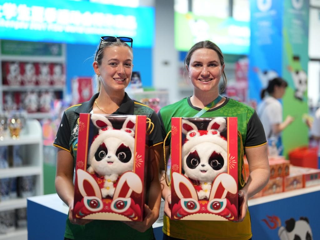 澳大利亞水球隊的露辛達·蘇珊和隊友逛了將近二十分鐘,最終選擇了戴著兔耳朵帽子的兔年版“蓉寶”,因為“覺得這個造型最可愛”,而當(dāng)大家給她解釋這個造型的來源時她才恍然大悟:“原來今年是中國的兔年?那我就知道為什么是這個造型了!”