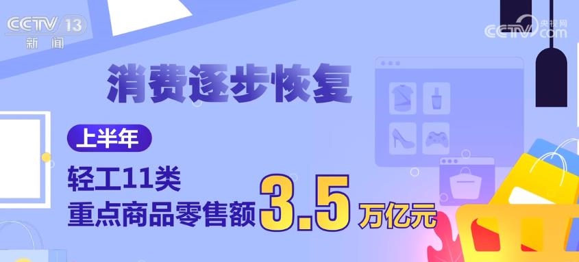 消費(fèi)逐步恢復(fù)。上半年,輕工11類重點(diǎn)商品零售額3.5萬(wàn)億元,占社會(huì)消費(fèi)品零售總額的15.4%,同比增長(zhǎng)6.3%。