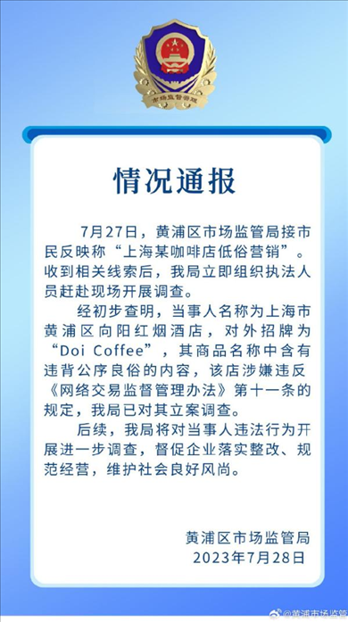 ·上海黃浦通報(bào)“咖啡店低俗營(yíng)銷”:違背公序良俗,已立案調(diào)查。