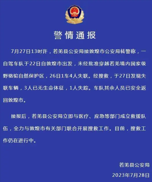 ·新疆若羌縣警方通報(bào)一車隊(duì)未經(jīng)批準(zhǔn)穿越自然保護(hù)區(qū):3人無(wú)生命體征,1人失蹤。