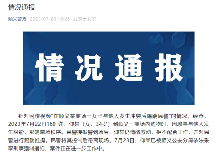 ·網(wǎng)傳“北京順義某商場(chǎng)一女子與他人發(fā)生沖突后踢踹民警”,警方通報(bào)。