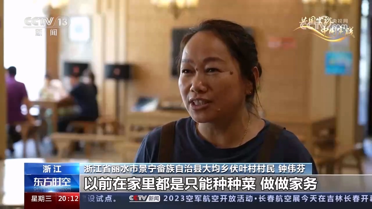 浙江省麗水市景寧畬族自治縣大均鄉(xiāng)伏葉村村民 鐘偉芬:以前在家里都只能種種菜、做家務,別的一分錢都掙不來,現(xiàn)在在家門口(就業(yè))。這里的服務員全部都是我們本村的,五六十歲了,出去打工也沒人要,在這里干干服務員一個月還能收入三千,這也很好的。
