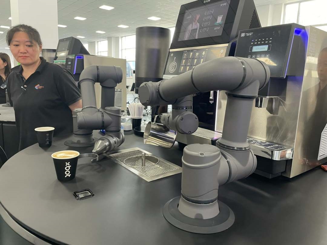 遨博(山東)智能機器人有限公司的六軸協(xié)作機器人,正在演示工業(yè)場景中的模塊組裝