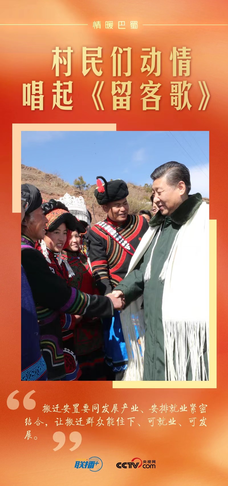總書記離開村子時(shí),身著彝族盛裝的鄉(xiāng)親們排起長(zhǎng)隊(duì)。村黨支部書記代表全村人向總書記獻(xiàn)上彝族傳統(tǒng)服飾查爾瓦,表達(dá)對(duì)總書記的愛戴之情。人群中有人唱起彝族民歌《留客歌》,鄉(xiāng)親們都跟著唱起來(lái)……掌聲、歌聲、歡呼聲在村子里久久回蕩。