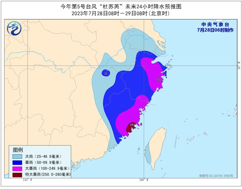 大風預報:28日08時至29日08時,巴士海峽、南海東部和南部、臺灣以東洋面、臺灣海峽、東海大部,以及臺灣島及其沿海、福建及其沿海、浙江及其沿海、江西東部、江蘇沿海、上海及其沿海、廣東東部沿海將有5-7級風、陣風8-9級,其中南海東北部偏東海域、臺灣海峽、福建南部的部分地區(qū)及沿海、臺灣島西部沿海風力可達8-12級、陣風13-15級,“杜蘇芮”中心經過的附近海域風力可達13-16級,陣風17級及以上。