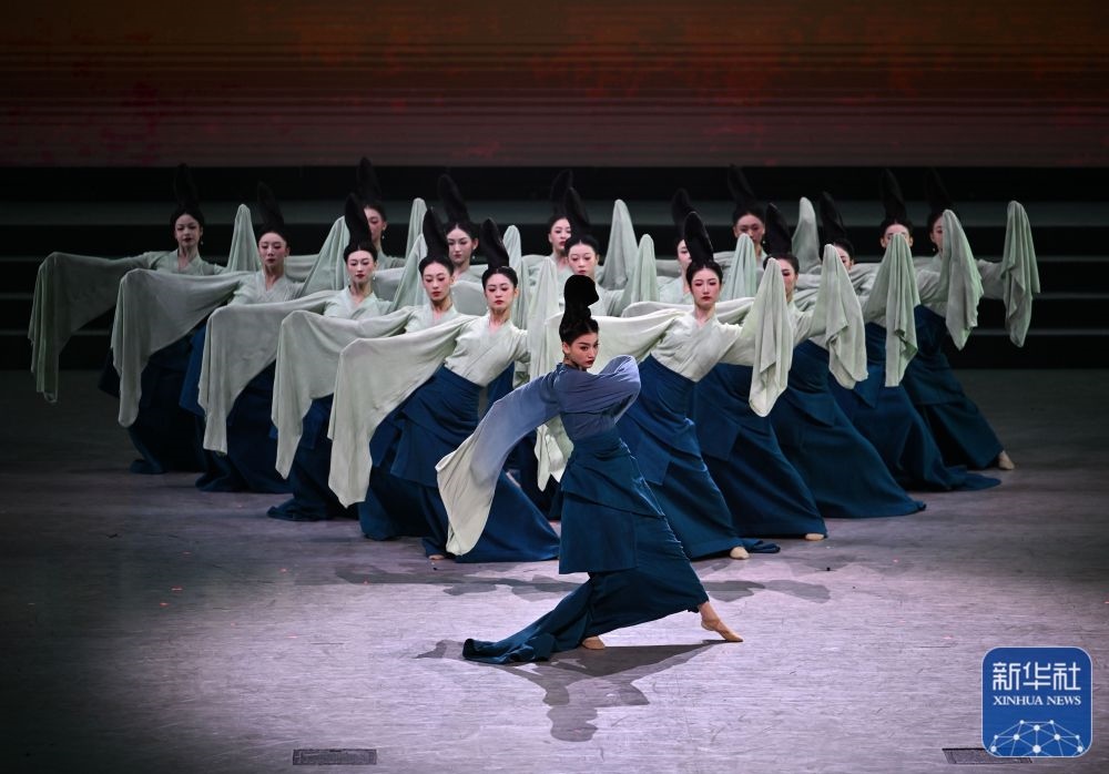↑7月29日,演員在聯(lián)歡會現(xiàn)場表演《只此青綠》。新華社記者 蔡湘鑫 攝