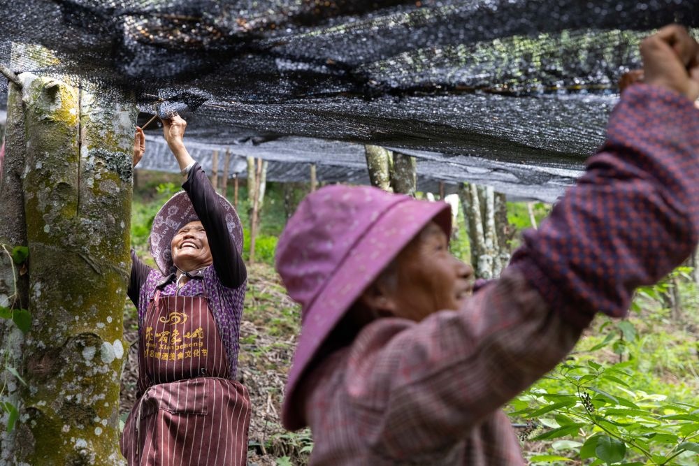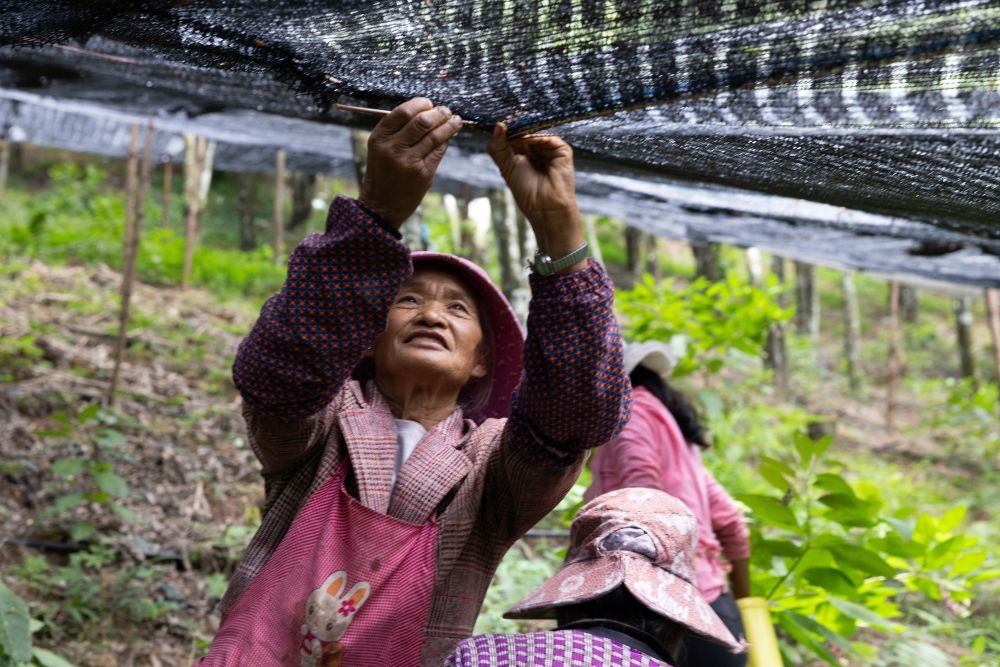 7月27日,工作人員在云南西疇縣西灑鎮(zhèn)的中藥材基地修補遮陽網(wǎng)。新華社記者 呂帥 攝