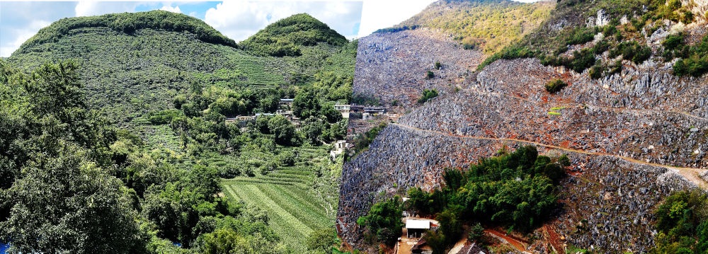 拼版照片:右圖為1991年拍攝的西疇縣大鄔麻村改造前的石漠化情況(西疇縣融媒體中心供圖);左圖為2023年7月26日拍攝的西疇縣大鄔麻村改造后的情況(新華社記者 費茂華 攝)。
