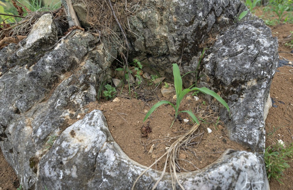 圖為2023年7月27日拍攝的一棵種在石頭凹里的玉米,西疇縣原來的土地大部分都是這樣的。新華社記者 費茂華 攝